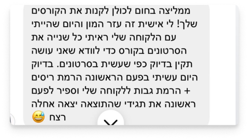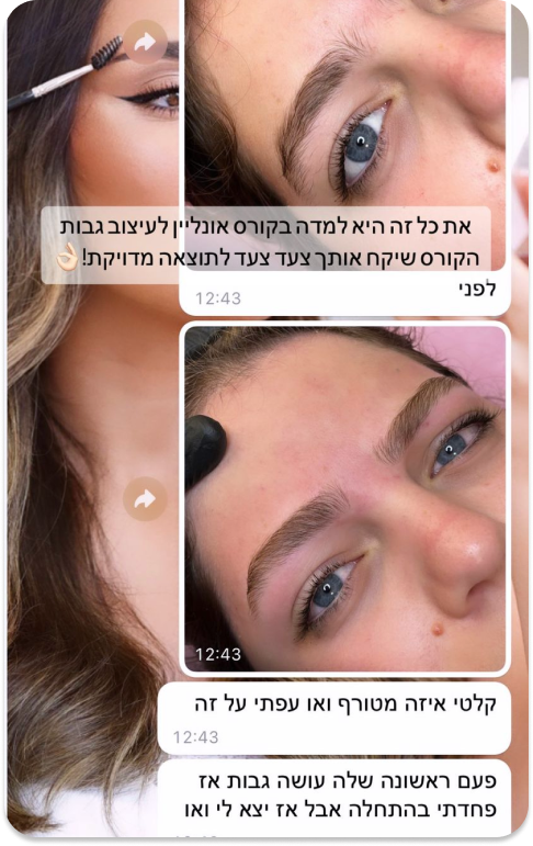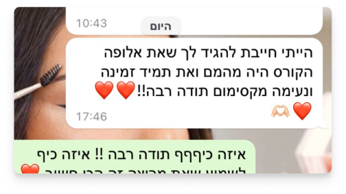 בנוסף, המחיר של ההכשרה הוא מציאה לעומת קורסים והכשרות פרונטליות שעולים אלפי שקלים, ותכלס? עם תוצאות כמו של התלמידות שלי זה שווה כל שקל. זו ההזדמנות שלך להשקיע בעצמך ובעתיד שלך.
