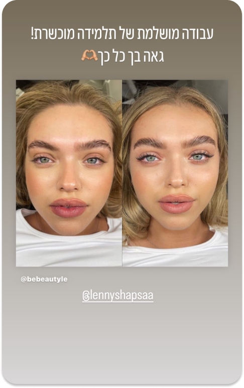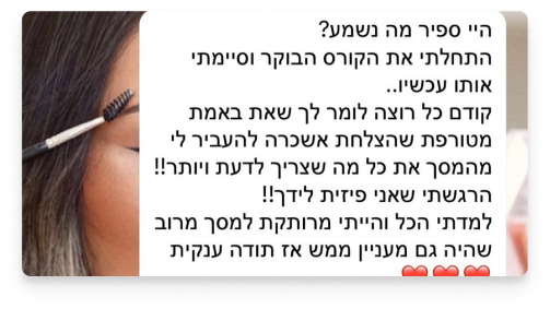 שהפכו לקוסמטיקאיות מצליחות שעובדות ומרוויחות בתחום שהן אוהבות, אני כל כך גאה ונרגשת להציע לך הזדמנות להצטרף אליי וללמוד בעצמך איך תוכלי להגשים את החלום, ללמוד מקצוע חדש ולקבל כבר בעוד חודש את הלקוחה הראשונה בדיוק כמו שאני עשיתי.