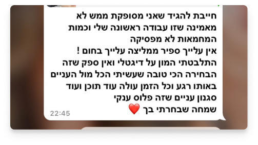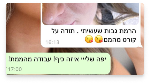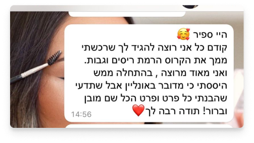ליווי ותמיכה 24/7 כולל קבוצת וואטספ של מקצועניות, איתך לאורך כל הדרך